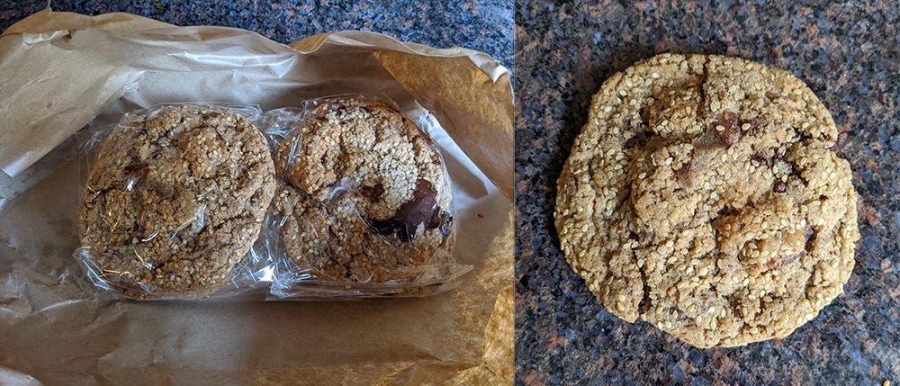 Not the kind the EU has outlawed giving without consent, this is an honest-to-god cookie subscription over the internet. Every month, $20 is taken out of my Paypal and at some unknown date I receive 6-8 cookies of a new flavor and variety sent via USPS (as if you needed another reason to support them). Gaia Valdemarsdottir uses very unique ingredients, and sometimes I like them and sometimes I don’t. Either way, it’s always a surprise and an adventure. This month featured Anson Mills whole wheat, caraway, Tony’s Chocolonely 70% chocolate, toasted sesame sourdough baguette pieces and benne seeds. If you’re looking for some variety, definitely click that link and get you some cookies.
