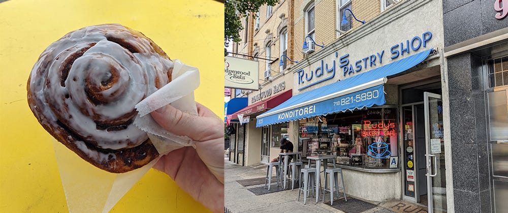 Rudy’s is a classic bakery in NYC, with a wide selection of pastries including ones the size of a dinner plate with names like “high danish” and “cheese ring”. The cinnamon roll definitely isn’t their specialty, and while it’s decent there isn’t anything particularly unique or standout about it. If you have other things to get there go for it, otherwise I’d walk the ten minutes down the road to L’imprimerie.